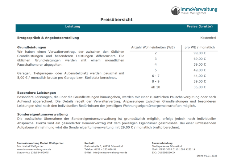 Gerne erstellen wir Ihnen ein persönliches Angebot, das genau auf Ihre Bedürfnisse zugeschnitten ist. Unsere aktuelle Preisübersicht können Sie hier herunterladen.